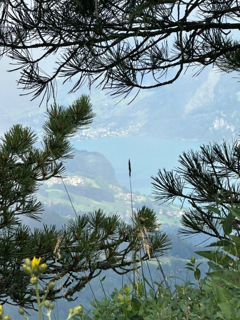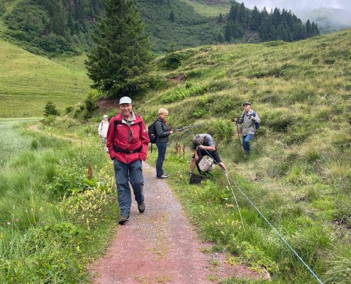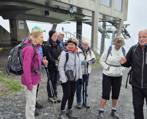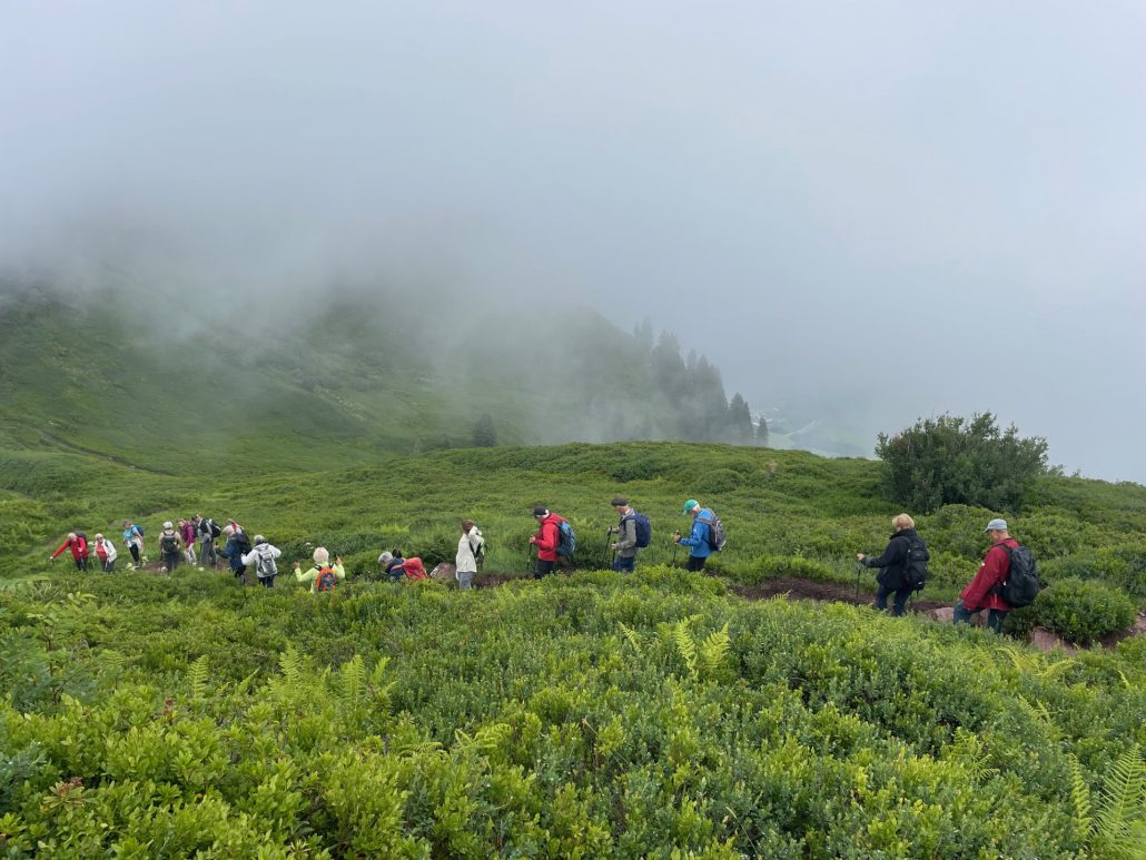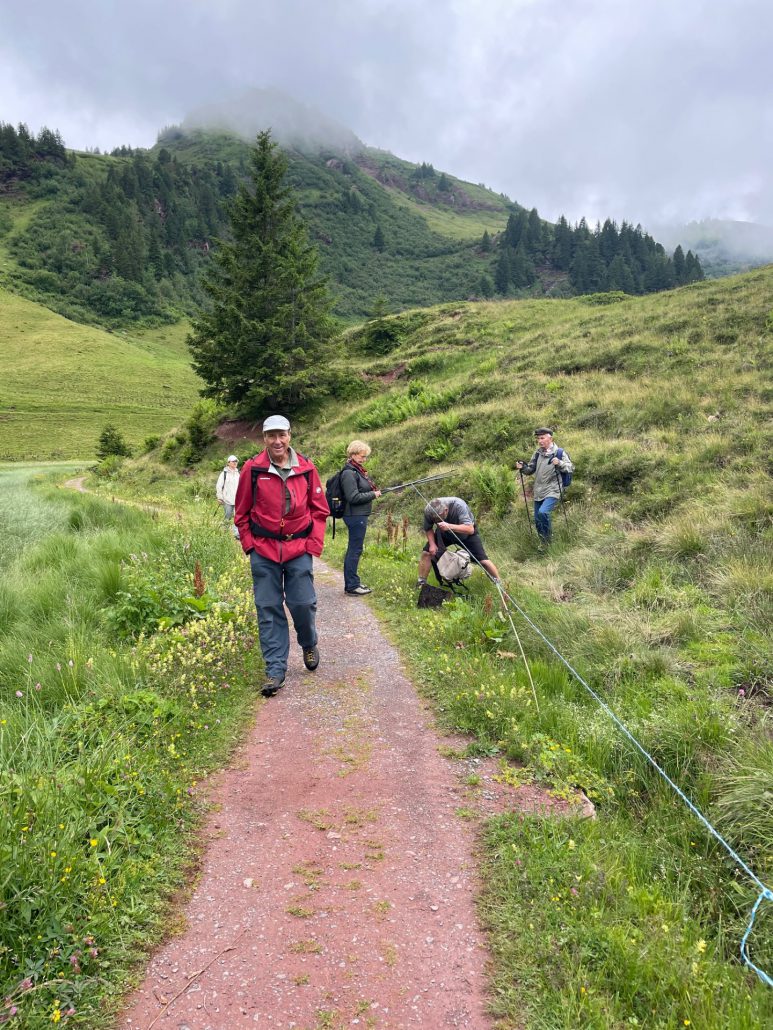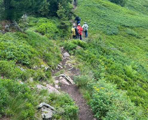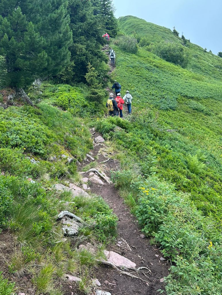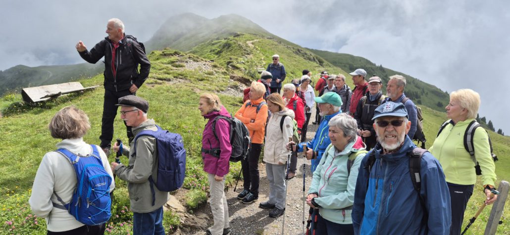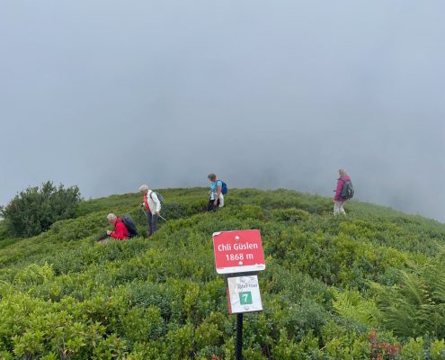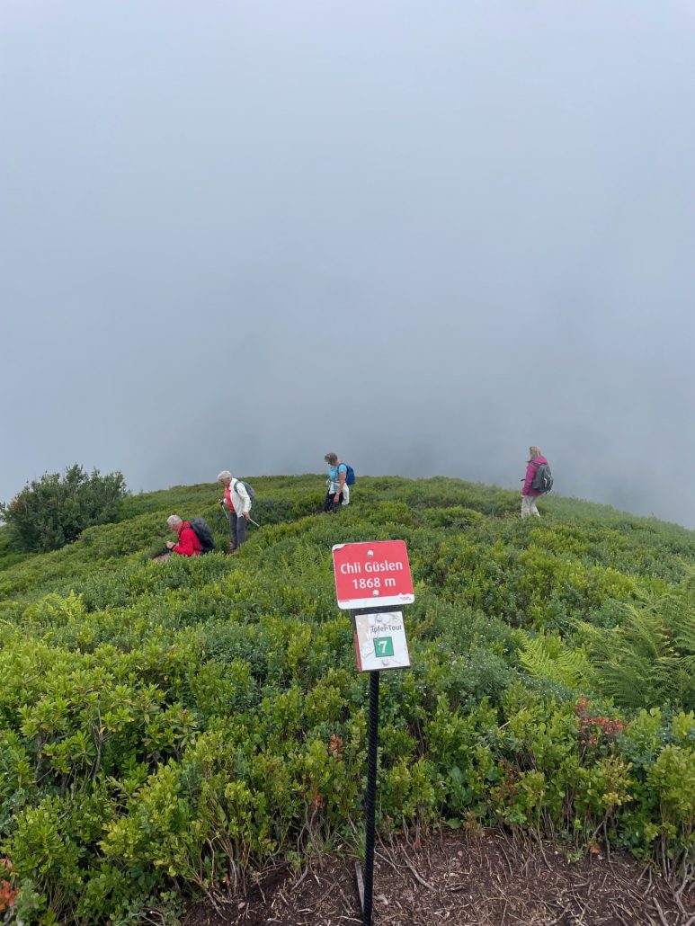 „WUNDERSCHÖN ABER ANSPRUCHSVOLL“ lautet ein Urteil einer Teilnehmerin über die 4 Gipfel Tour, die entgegen dem was der Name erwarten lässt, mehrheitlich abwärts führt vom Maschgenkamm zum Tannenboden. Als erstes umwandern wir gemütlich den Ziger (erster Gipfel). Vor dem schmalen Aufstieg zum Cuncels (zweiter Gipfel) entscheiden sich sechs Mitwandernde für die Fahrstrasse zur Seebenalp. Dort wollen Sie im Restaurant auf uns warten. Der Rest wendet sich dem Bergpfad zu und erreicht nach einem kurzen Aufstieg und dann Abstieg – wirklich anspruchsvoll, weil schmal, teilweise steil und noch etwas feucht – den Chli Güslen (dritter Gipfel). Kurz nachher verteilen wir uns dem Weg entlang zum Picknick wo es gerade keine Heidelbeerstauden hat – es gibt leider nirgends bequeme Bänkli, was ja auch nicht wirklich jemand erwartet oder doch? Frisch gestärkt lassen wir den Gross Güslen (vierter Gipfel) links liegen und wandern weiter abwärts – etwas weniger kritisch – dann dem romantischen Seeli entlang zur Seebenalp. Von da geht es wieder vollzählig weiter auf der Strasse zur Tannenbodenalp. Dort bleibt vor der Talfahrt etwas Zeit individuell einen Kaffee (Luz), eine Erfrischung oder auch ein Glace zu geniessen. Für mich als Wanderleiter sehr beruhigend und schön zu erleben, dass alle pünktlich auf dem Perron in Unterterzen stehen. Toll! Danke! Weil für uns der letzte Wagen im Sektor F reserviert ist – Smartphone und Zugs Info sei Dank wissen wir das im Voraus – gibt es fast noch eine kleine zusätzliche Tour.