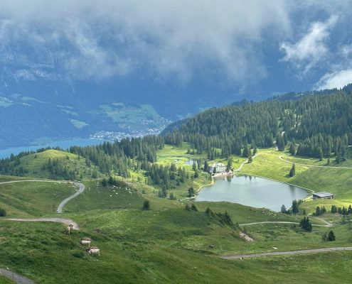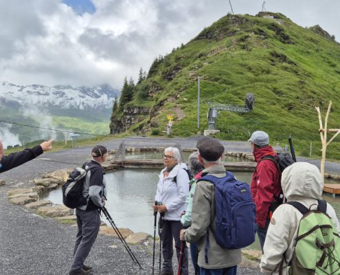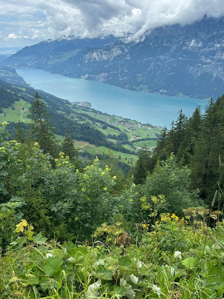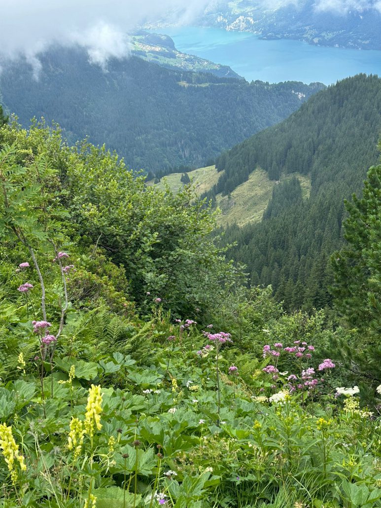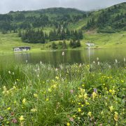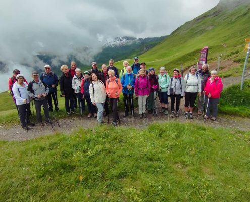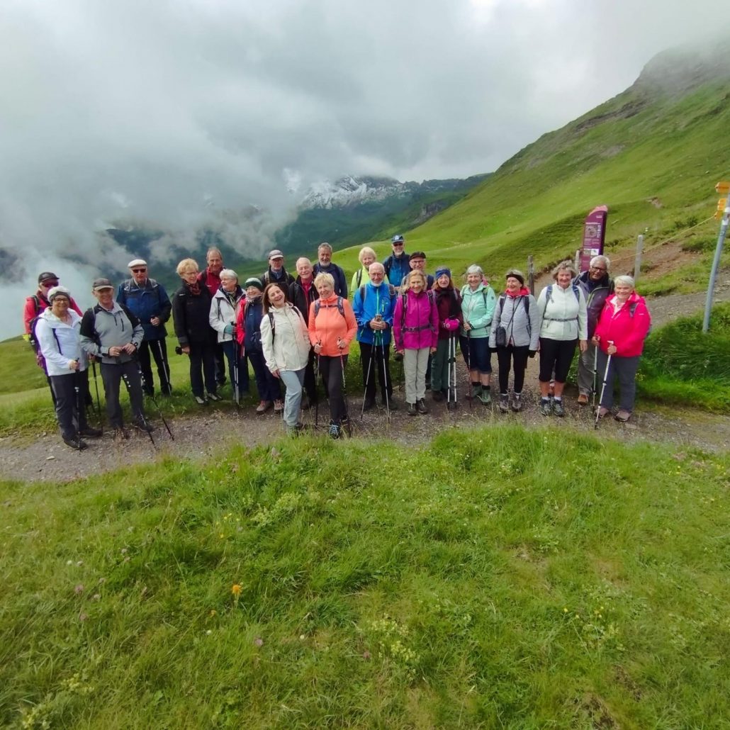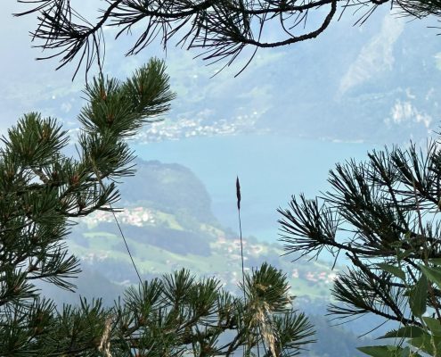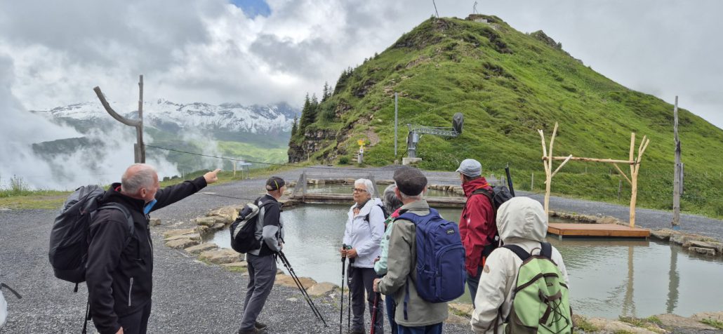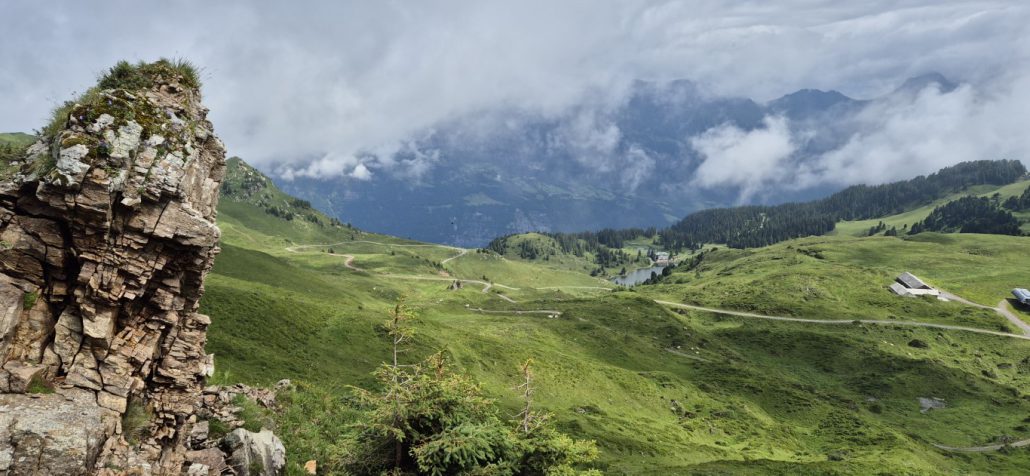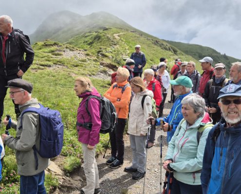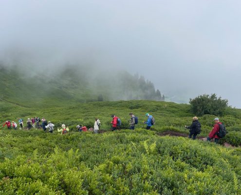 „WUNDERSCHÖN ABER ANSPRUCHSVOLL“ lautet ein Urteil einer Teilnehmerin über die 4 Gipfel Tour, die entgegen dem was der Name erwarten lässt, mehrheitlich abwärts führt vom Maschgenkamm zum Tannenboden. Als erstes umwandern wir gemütlich den Ziger (erster Gipfel). Vor dem schmalen Aufstieg zum Cuncels (zweiter Gipfel) entscheiden sich sechs Mitwandernde für die Fahrstrasse zur Seebenalp. Dort wollen Sie im Restaurant auf uns warten. Der Rest wendet sich dem Bergpfad zu und erreicht nach einem kurzen Aufstieg und dann Abstieg – wirklich anspruchsvoll, weil schmal, teilweise steil und noch etwas feucht – den Chli Güslen (dritter Gipfel). Kurz nachher verteilen wir uns dem Weg entlang zum Picknick wo es gerade keine Heidelbeerstauden hat – es gibt leider nirgends bequeme Bänkli, was ja auch nicht wirklich jemand erwartet oder doch? Frisch gestärkt lassen wir den Gross Güslen (vierter Gipfel) links liegen und wandern weiter abwärts – etwas weniger kritisch – dann dem romantischen Seeli entlang zur Seebenalp. Von da geht es wieder vollzählig weiter auf der Strasse zur Tannenbodenalp. Dort bleibt vor der Talfahrt etwas Zeit individuell einen Kaffee (Luz), eine Erfrischung oder auch ein Glace zu geniessen. Für mich als Wanderleiter sehr beruhigend und schön zu erleben, dass alle pünktlich auf dem Perron in Unterterzen stehen. Toll! Danke! Weil für uns der letzte Wagen im Sektor F reserviert ist – Smartphone und Zugs Info sei Dank wissen wir das im Voraus – gibt es fast noch eine kleine zusätzliche Tour.