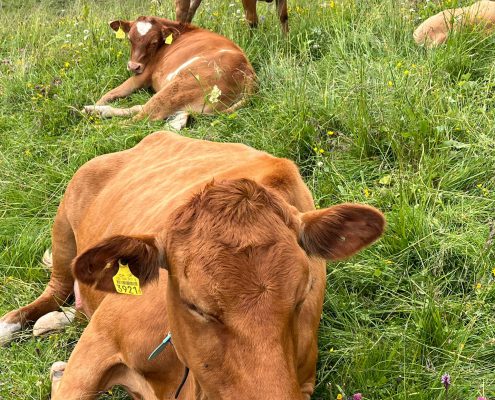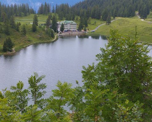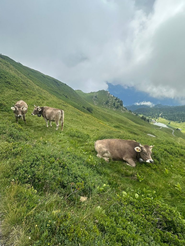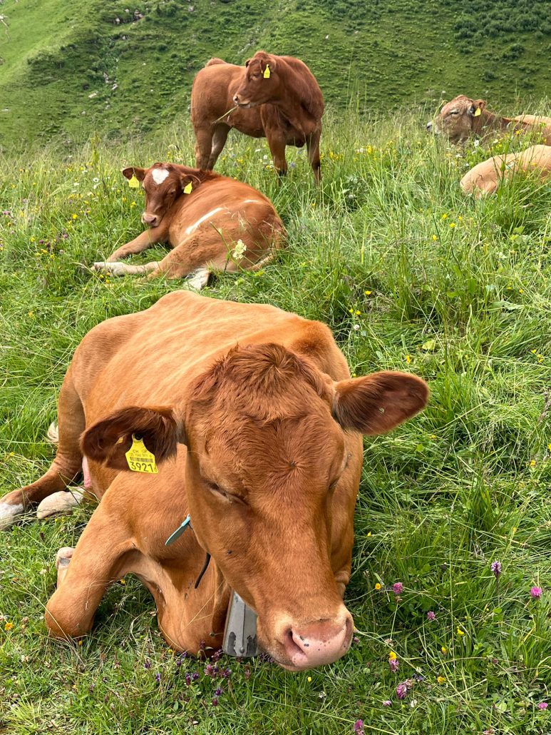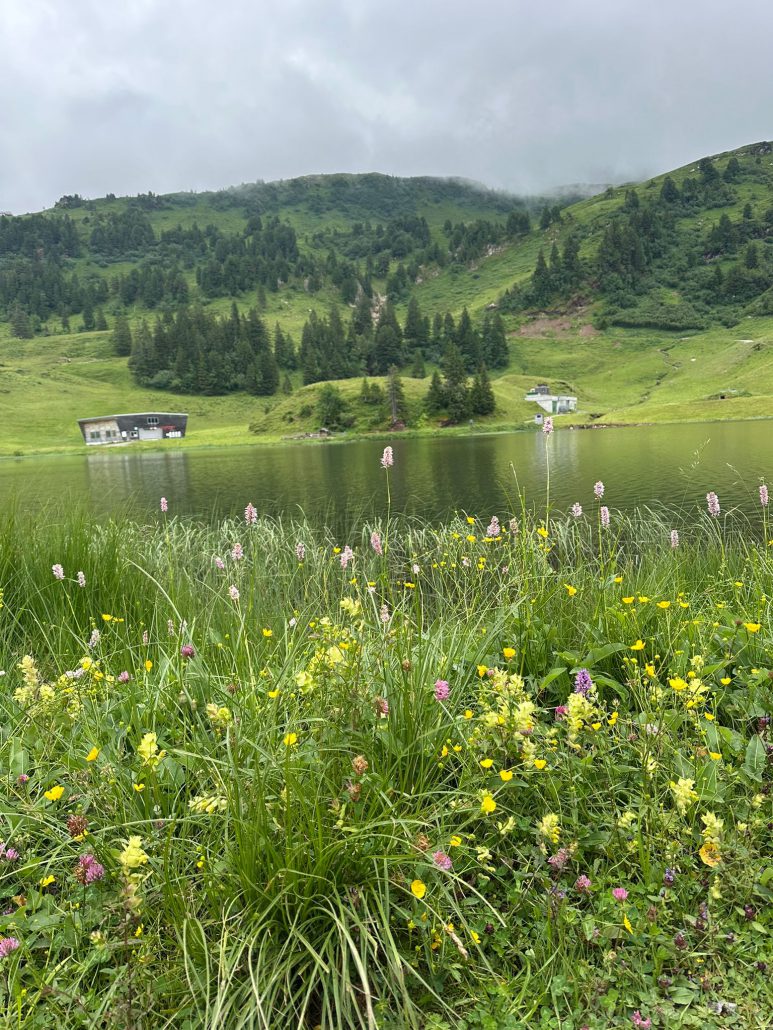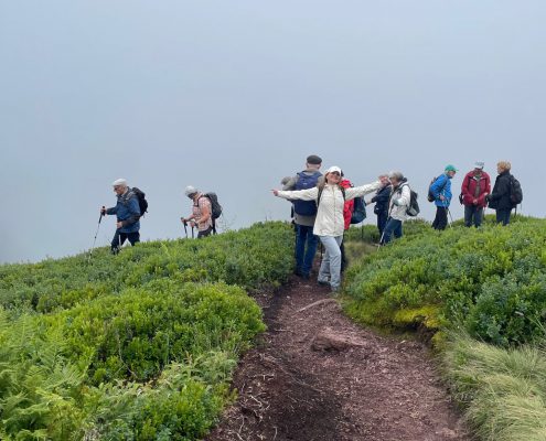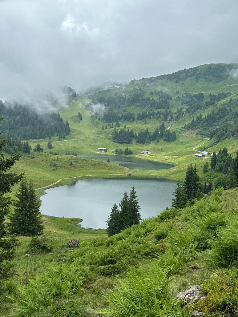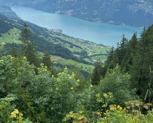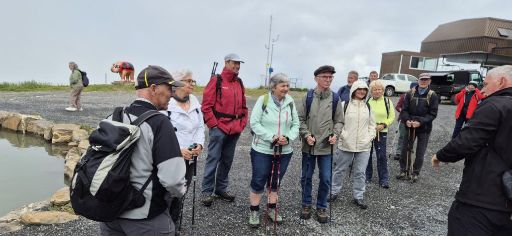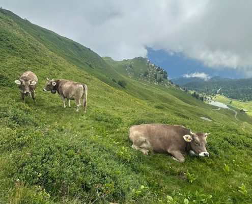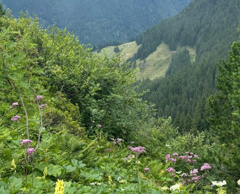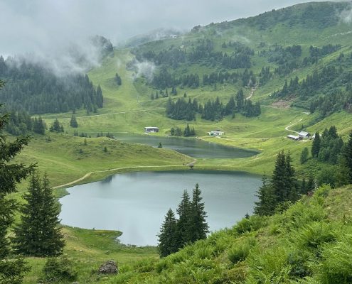 „WUNDERSCHÖN ABER ANSPRUCHSVOLL“ lautet ein Urteil einer Teilnehmerin über die 4 Gipfel Tour, die entgegen dem was der Name erwarten lässt, mehrheitlich abwärts führt vom Maschgenkamm zum Tannenboden. Als erstes umwandern wir gemütlich den Ziger (erster Gipfel). Vor dem schmalen Aufstieg zum Cuncels (zweiter Gipfel) entscheiden sich sechs Mitwandernde für die Fahrstrasse zur Seebenalp. Dort wollen Sie im Restaurant auf uns warten. Der Rest wendet sich dem Bergpfad zu und erreicht nach einem kurzen Aufstieg und dann Abstieg – wirklich anspruchsvoll, weil schmal, teilweise steil und noch etwas feucht – den Chli Güslen (dritter Gipfel). Kurz nachher verteilen wir uns dem Weg entlang zum Picknick wo es gerade keine Heidelbeerstauden hat – es gibt leider nirgends bequeme Bänkli, was ja auch nicht wirklich jemand erwartet oder doch? Frisch gestärkt lassen wir den Gross Güslen (vierter Gipfel) links liegen und wandern weiter abwärts – etwas weniger kritisch – dann dem romantischen Seeli entlang zur Seebenalp. Von da geht es wieder vollzählig weiter auf der Strasse zur Tannenbodenalp. Dort bleibt vor der Talfahrt etwas Zeit individuell einen Kaffee (Luz), eine Erfrischung oder auch ein Glace zu geniessen. Für mich als Wanderleiter sehr beruhigend und schön zu erleben, dass alle pünktlich auf dem Perron in Unterterzen stehen. Toll! Danke! Weil für uns der letzte Wagen im Sektor F reserviert ist – Smartphone und Zugs Info sei Dank wissen wir das im Voraus – gibt es fast noch eine kleine zusätzliche Tour.