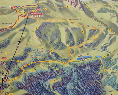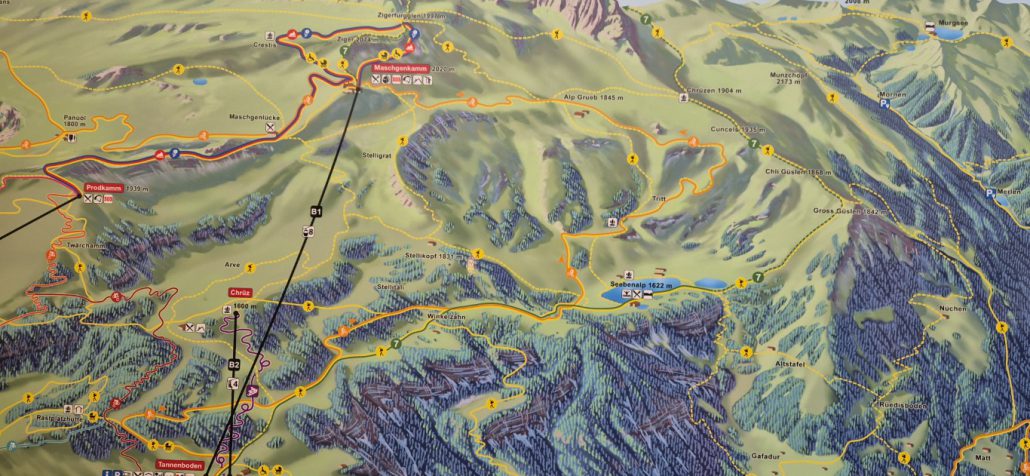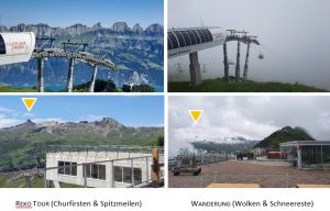Nach zwei Tagen Regen treffen wir uns am Morgen im Sonnenschein. Schade nur, dass der Himmel je näher wir dem Flumserberg kommen bedeckter wird, leider genau nach Wetterprognose. Dies hat uns weitgehend die wunderschöne Aussicht auf die umliegenden Berge vermiest. Hoffen darf man ja! Wir müssen mit den Bildern von der Rekognoszierung Vorlieb nehmen oder halt die Tour privat wiederholen.