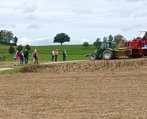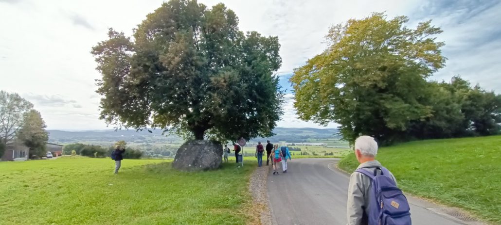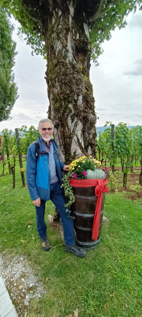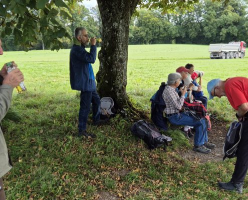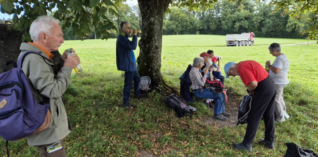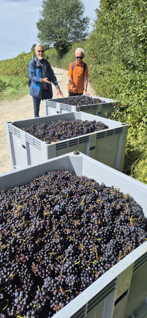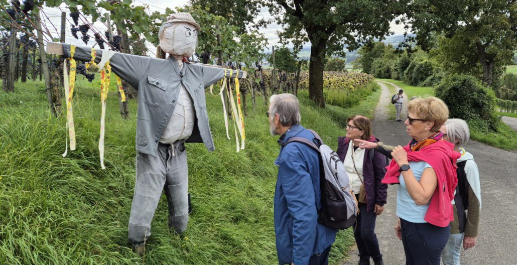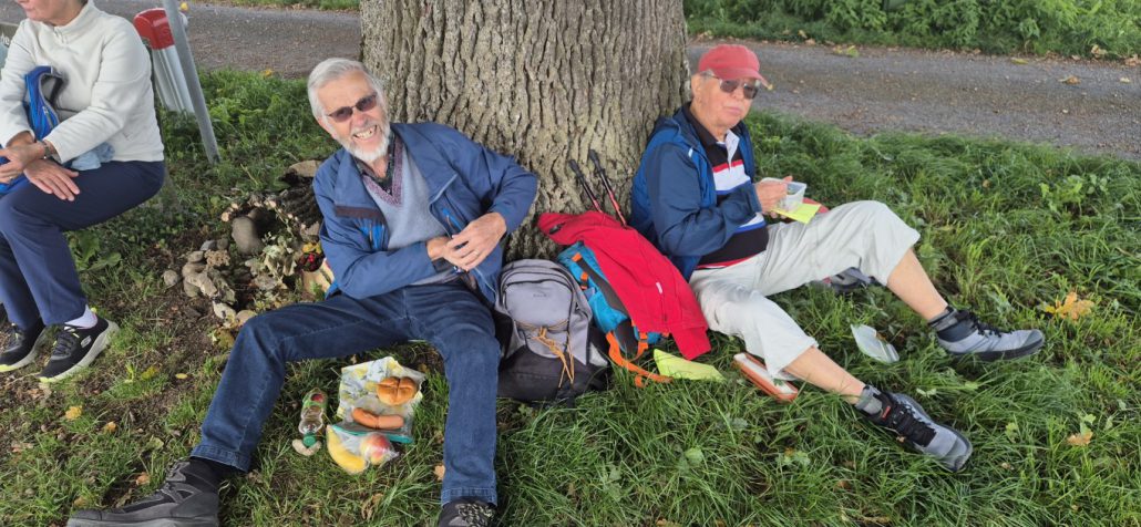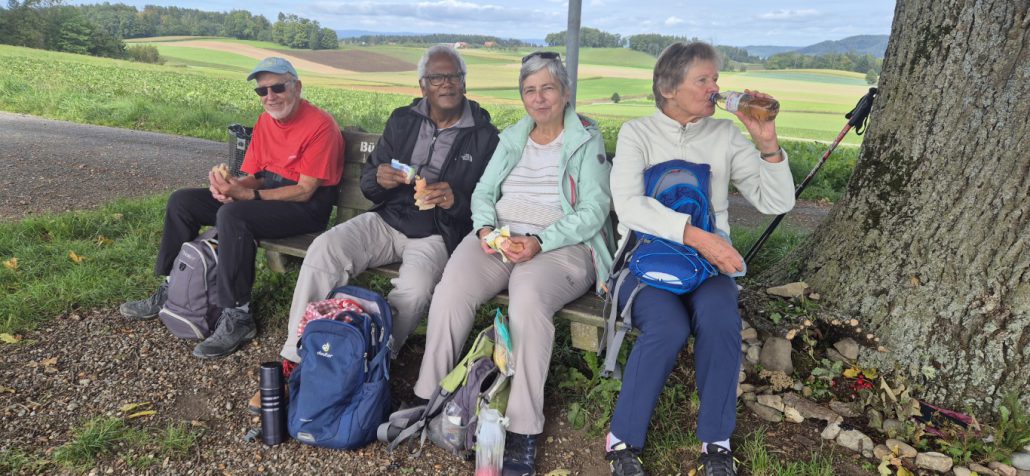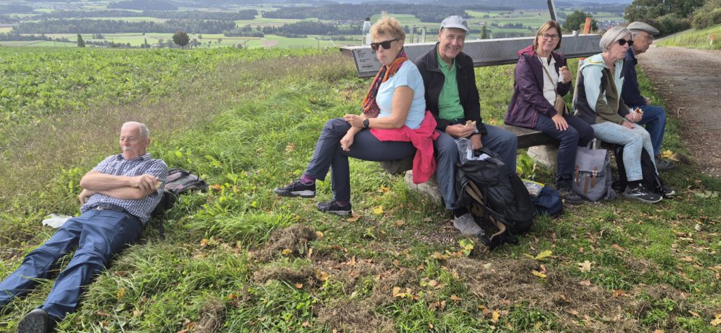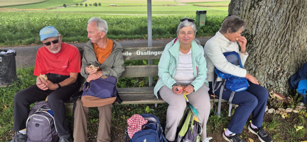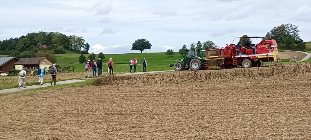 Die Wanderung dazwischen verkommt fasst zur Nebensache. Wir nehmen es gemütlich. Wir haben Zeit und geniessen die Tour. Etwa in der Mitte unseres Weges setzen wir uns zum Picknick unter einem grossen Baum, so es Platz hat aufs Bänkli oder dann eben. auf den Boden. Unterwegs sind die Ackerbauern am Kartoffeln ernten und die Weinbauern am „wümme. Die weissen Trauben sind abgelesen, die Blauen hängen noch.