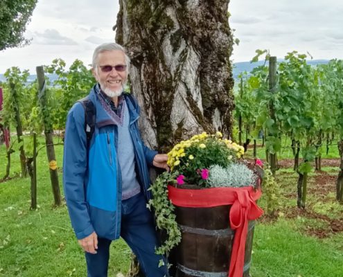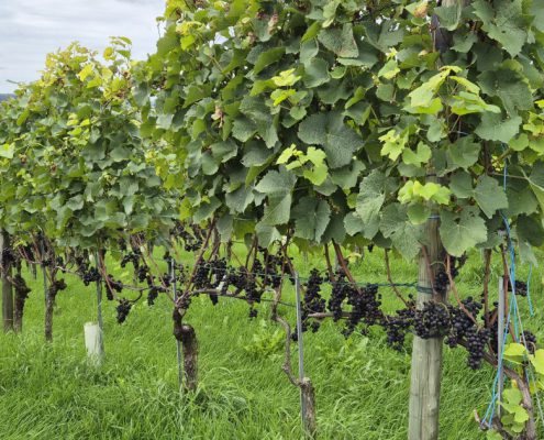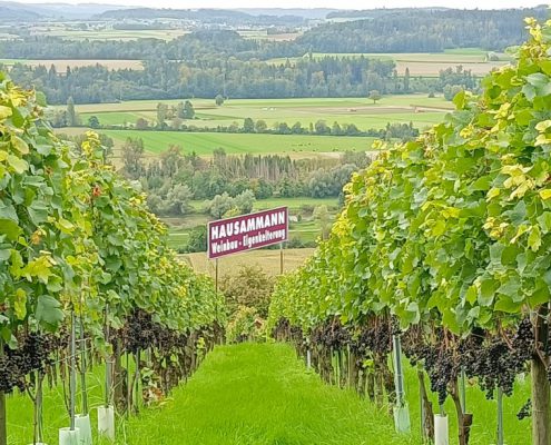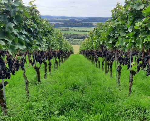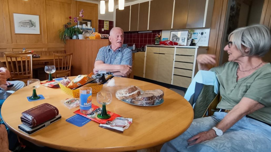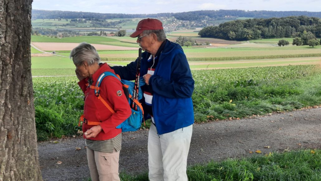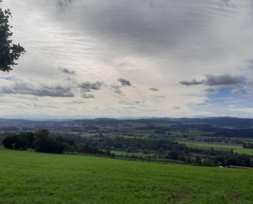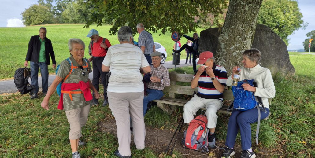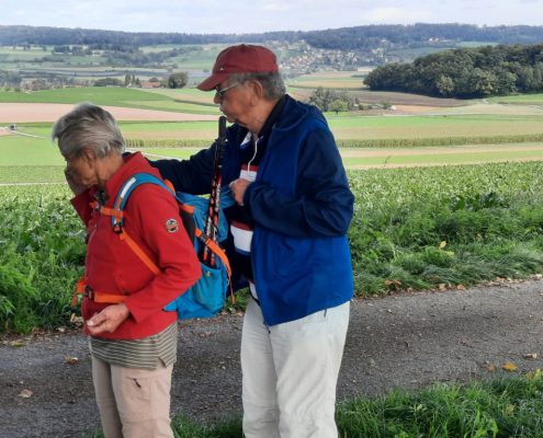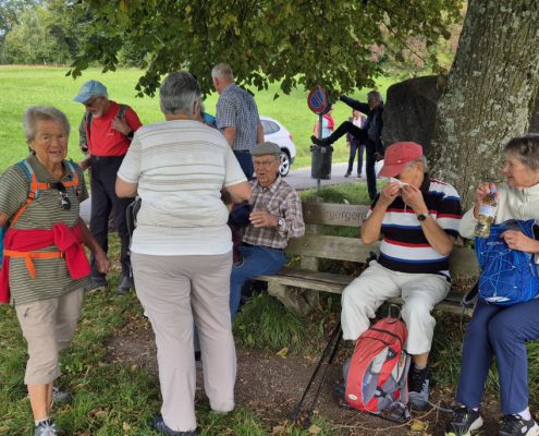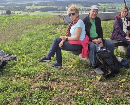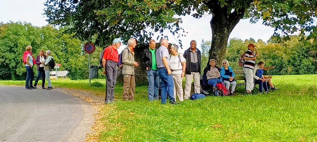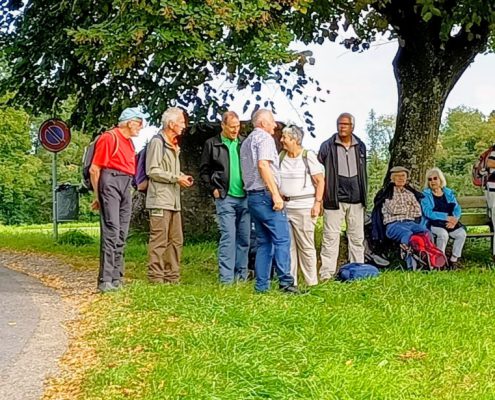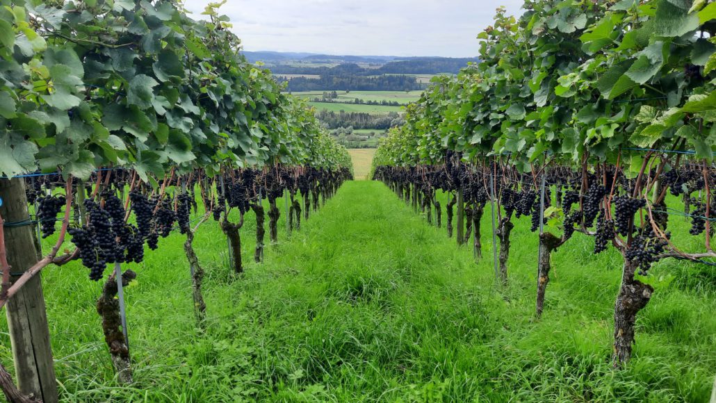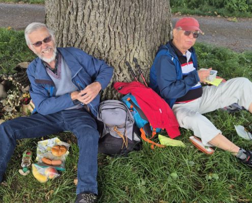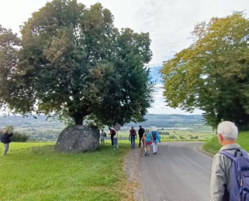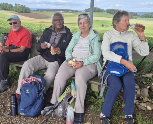 Die Wanderung dazwischen verkommt fasst zur Nebensache. Wir nehmen es gemütlich. Wir haben Zeit und geniessen die Tour. Etwa in der Mitte unseres Weges setzen wir uns zum Picknick unter einem grossen Baum, so es Platz hat aufs Bänkli oder dann eben. auf den Boden. Unterwegs sind die Ackerbauern am Kartoffeln ernten und die Weinbauern am „wümme. Die weissen Trauben sind abgelesen, die Blauen hängen noch.