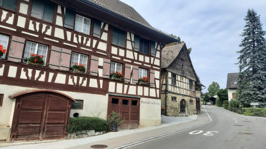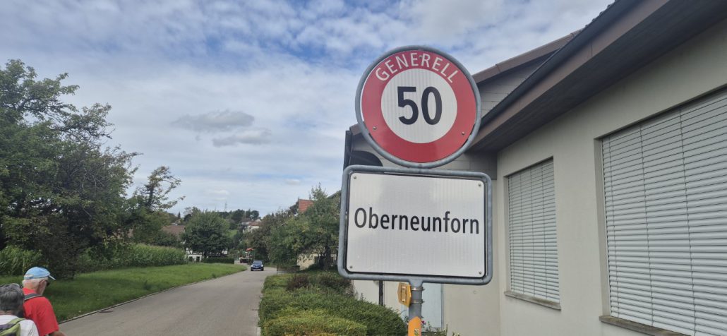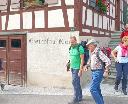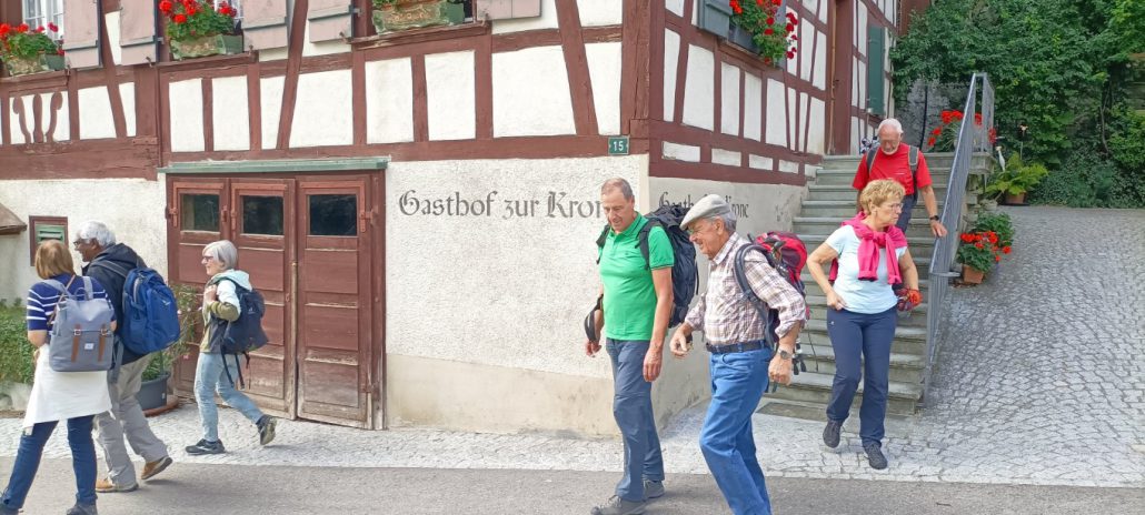 • und zweitens das noch ursprüngliche Dorfrestaurant Krone in Oberneunforn in einem alten Riegelhaus. Es ist heutzutage noch offen auf Anfrage für Wandergruppen und nach Feierabend für die Dorfbevölkerung. So haben wir die Wirtsstube ganz für uns, um uns nach der Wanderung zu erfrischen. Der Erstklässler Leon, voll konzentriert mit zwei Händen das Glas auf dem Bierdeckel balancierend, ist ein prima Kellner und, als er das mit dem Trinkgeld entdeckt hat, besonders eifrig. Unterstützung erhält er durch die Oma.